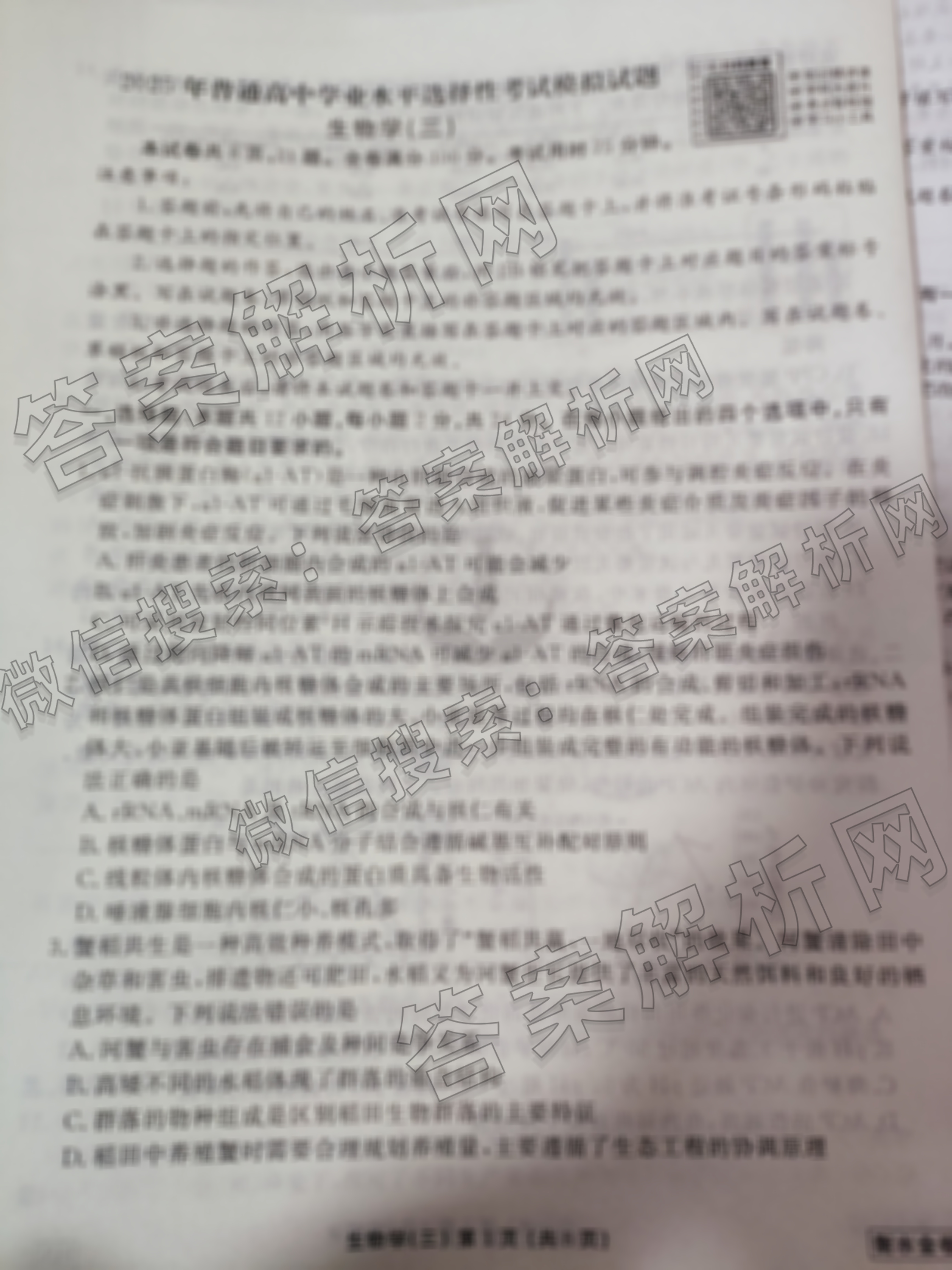 衡水金卷先享题·调研卷 2025年普通高中学业水平选择性考试模拟试题 生物(HN)(三)3试题由衡水金卷答案整理,获取更多衡水金卷先享题答案解析,请在各大应用商店搜索下载答案解析网APP。