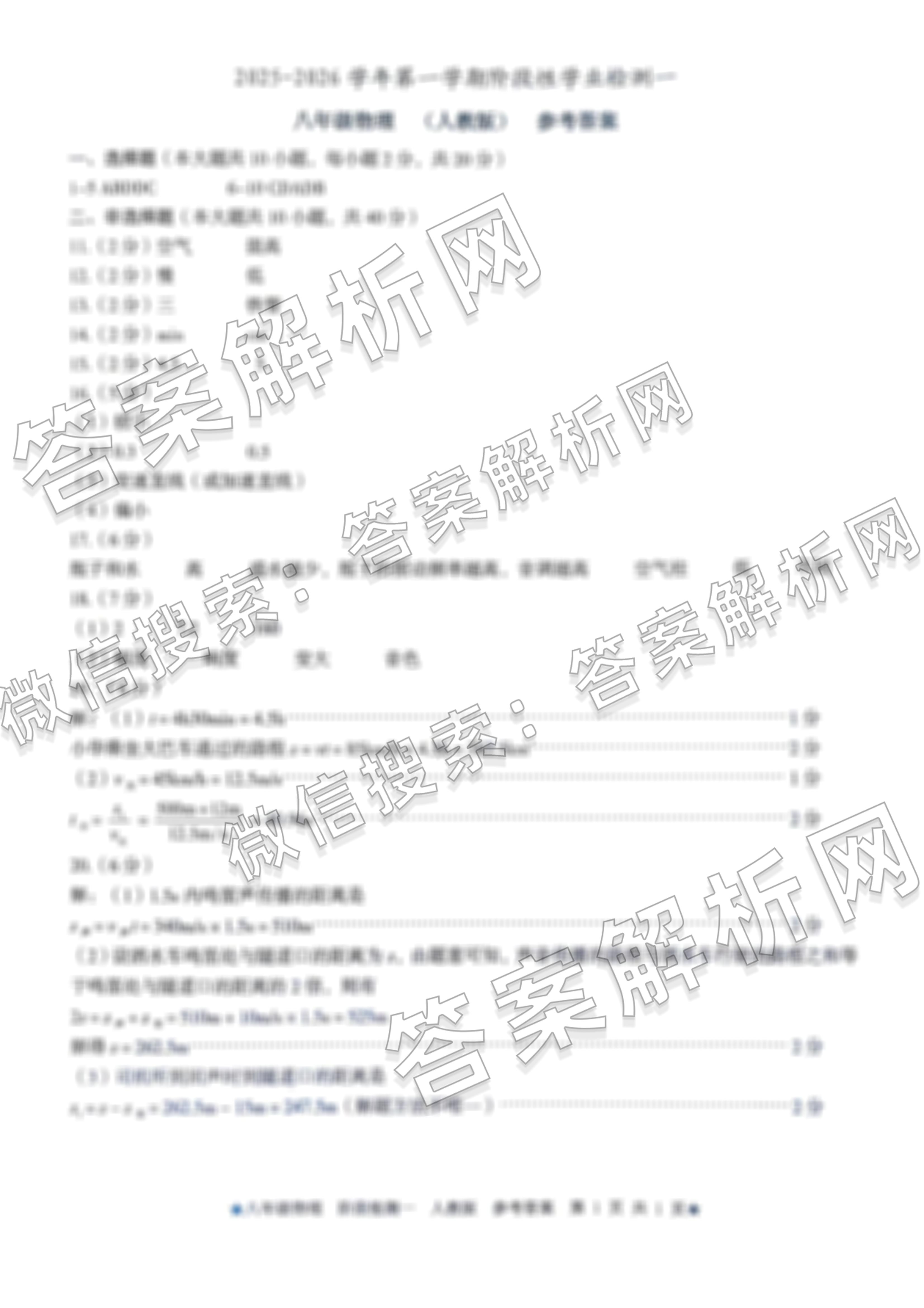 2025~2026河北省学年第一学期阶段性学业检测一[八年级]物理(人教版)答案